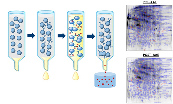 現(xiàn)階段,常用的HCP抗體覆蓋率驗證的方法都存在其自身的局限性。AAE方法解決了傳統(tǒng)2DWB中的低靈敏度和低特異性的問題。而且,由于AAE可以在富集本身含量較低的HCP的同時,還可以大幅降低中間品和終產(chǎn)品中的藥物蛋白。這使對中間品和終產(chǎn)品中HCP與HCP抗體的反應(yīng)情況的分析成為可能。盡管如此,AAE和銀染分析也不能具體得知樣品中具體有哪些種類的HCP,尤其是那些與人體有較高免疫原性和對藥物有較大影響的HCP?;谝陨蠁栴}的考慮,Cygnus利用更精準的質(zhì)譜檢測方法與AAE相結(jié)合,推出了新一代的AAE和Mass Spectrum覆蓋率驗證服務(wù)。