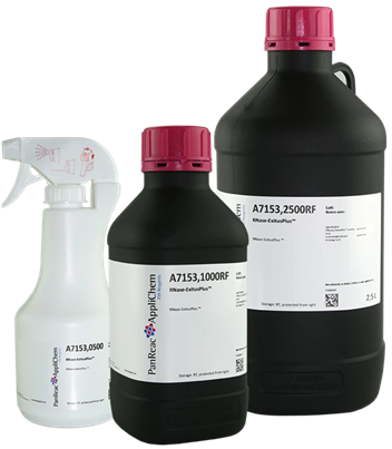 在mRNA疫苗的生產(chǎn)以及其他與mRNA相關的生物制品中,RNase污染的清除尤為重要,德國Applichem研發(fā)的RNase-ExitusPlus?是一種非堿性、無腐蝕性且無致癌性的新型RNase清除液,它對RNase污染物具有很好的清除性能,是適用于任何表面的即用型RNase污染清除液,可用于實驗室表面的清潔,如實驗操作臺、電泳設備、移液器和反應管等。