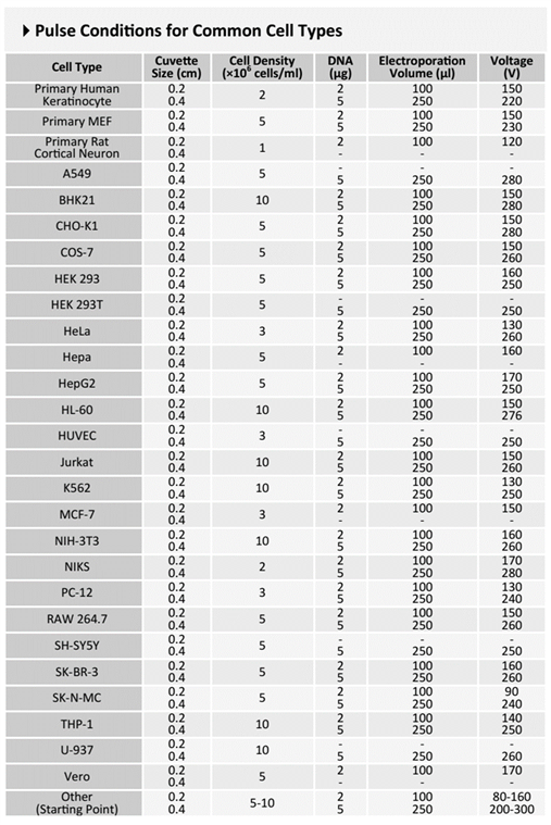 不同細(xì)胞電轉(zhuǎn)染參數(shù)推薦