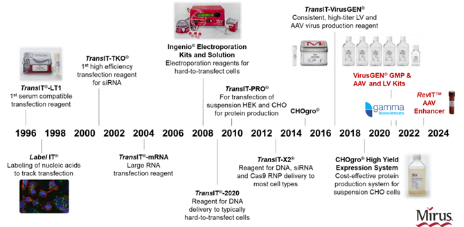 為什么Mirus TransIT-X2? Dynamic Delivery System有著如此高性能及廣泛適應(yīng)性呢?這歸因于Mirus強(qiáng)大且高效的專利遞轉(zhuǎn)平臺(tái)設(shè)計(jì),可進(jìn)行多重、多功能組合的轉(zhuǎn)染試劑組分篩選并優(yōu)化。成立于1995年的Mirus,專注及深耕核酸遞轉(zhuǎn)領(lǐng)域多年(圖1),從最早具有低毒性的TransIT ? -LT1到GMP級(jí)別、可用于AAV和LV生產(chǎn)的TransIT-VirusGEN?,都是基于該遞轉(zhuǎn)平臺(tái)進(jìn)行設(shè)計(jì)及開發(fā)的。截至目前,使用Mirus產(chǎn)品發(fā)表文章已超過(guò)1萬(wàn)篇,并且發(fā)表文章及Mirus數(shù)據(jù)庫(kù)涵蓋了超過(guò)1200種細(xì)胞類型,更多文章及數(shù)據(jù)查詢,請(qǐng)點(diǎn)擊這里。