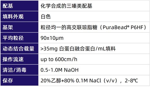 AlbuPure®是Astrea Bioseparations和Albumedix公司合作開發(fā)的白蛋白親和層析填料,填料基架是粒徑均一的高交聯(lián)瓊脂糖,配基是合成的三嗪化合物,具體高流速、高動態(tài)結(jié)合載量、強(qiáng)化學(xué)耐受性等特點,主要用于白蛋白融合蛋白的純化。AlbuPure®的性能參數(shù)如下表所示。