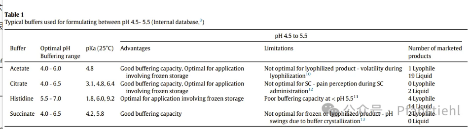 盡管在液體和凍干產(chǎn)品中,組氨酸在pH 5.5至6.5的范圍內(nèi)都占據(jù)主導(dǎo)地位,但如果目標(biāo)pH值在4.5至5.5之間,我們依然還有另外三種緩沖液可選,即醋酸鹽、檸檬酸鹽和琥珀酸鹽。這些緩沖物質(zhì)存在某些固有的挑戰(zhàn),阻礙了它們在靜脈和皮下給藥以及液體和凍干劑型方面的廣泛使用。而組氨酸的pKa值為6,在pH<5.5時(shí)緩沖性較差,因此在4.5至5.5的pH范圍內(nèi)應(yīng)用有限。雖然醋酸鹽在此范圍內(nèi)具有良好的緩沖能力,但其易揮發(fā)和冷凍干燥過程中溶劑的過度損失是其應(yīng)用相關(guān)的潛在挑戰(zhàn)。檸檬酸鹽緩沖制劑在皮下應(yīng)用中使用有限,原因是在皮下注射期間存在壞死的風(fēng)險(xiǎn)。琥珀酸鹽在pH4.5至5.5之間提供了強(qiáng)大的緩沖能力,但由于琥珀酸鹽結(jié)晶影響產(chǎn)品穩(wěn)定性而導(dǎo)致pH值劇烈波動(dòng)的風(fēng)險(xiǎn),通常避免其用于冷凍或凍干的應(yīng)用。以下表格總結(jié)了在注射制劑中使用這四種緩沖液的局限性[1]。
