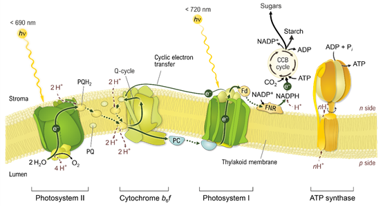 植物光合作包括光能的吸收、能量轉(zhuǎn)換、電子傳遞、ATP的合成以及CO2的固定等步驟,這一過(guò)程主要在植物的葉綠體的類(lèi)囊體膜上完成的。類(lèi)囊體膜上存在四種關(guān)鍵的蛋白復(fù)合體:光系統(tǒng)II(PS II)、Cytb6/f復(fù)合體、光系統(tǒng)I(PS I)和ATP合成酶,這四種復(fù)合體協(xié)同作用,共同完成光反應(yīng)。光系統(tǒng)II上具有捕光色素復(fù)合體(LHC)構(gòu)成的天線系統(tǒng),可以捕獲光能,而光系統(tǒng)I則利捕獲后的能量進(jìn)行原初光化學(xué)反應(yīng)。Cytb6/f復(fù)合體在電子傳遞過(guò)程中起著至關(guān)重要的作用,ATP合成酶則負(fù)責(zé)合成ATP,為植物細(xì)胞提供能量。