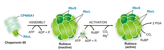 CO2的固定是利用光反應(yīng)產(chǎn)生的ATP和NADPH合成有機(jī)物的過(guò)程,該過(guò)程稱(chēng)為卡爾文循環(huán)。1,5二磷酸核酮糖羧化/加氧酶(Rubisco)是CO2固定過(guò)程中的關(guān)鍵限速酶,催化CO2和RuBP(核酮糖-1,5-二磷酸)發(fā)生羧化、然后裂解形成兩個(gè)PGA(甘油酸-3-磷酸)分子。所有光合生物都具有由8個(gè)大亞基RbcL和8個(gè)小亞基Rbcs組成的I型Rubisco,且RbcL折疊到其天然狀態(tài)依賴(lài)于葉綠體定位的分子伴侶CPN60的作用。