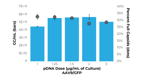 TransIT®-AAViator 轉(zhuǎn)染系統(tǒng),降低了至少一半質(zhì)粒 DNA使用量 ,同時(shí)仍可保持高水平的滴度和實(shí)心率,進(jìn)一步降低了批次生產(chǎn)成本。