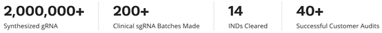 Synthego提供的GMP級(jí)gRNA與核酸酶產(chǎn)品嚴(yán)格遵循GMP標(biāo)準(zhǔn)進(jìn)行開發(fā),專為滿足IND申報(bào)以及臨床應(yīng)用所要求的高精度標(biāo)準(zhǔn)而設(shè)計(jì)??蛻艨梢劳?/span>Synthego先進(jìn)的生產(chǎn)平臺(tái),確保其研發(fā)流程符合全球最嚴(yán)格的監(jiān)管規(guī)范。截至目前,Synthego已成功支持超過12項(xiàng)CRISPR基因編輯療法的IND申報(bào),在行業(yè)內(nèi)建立了高度可信的品牌聲譽(yù)。其持續(xù)穩(wěn)定的GMP級(jí)產(chǎn)品供應(yīng)能力,充分體現(xiàn)了Synthego致力于推動(dòng)以臨床療效為導(dǎo)向的基因編輯技術(shù)革新的長期承諾。