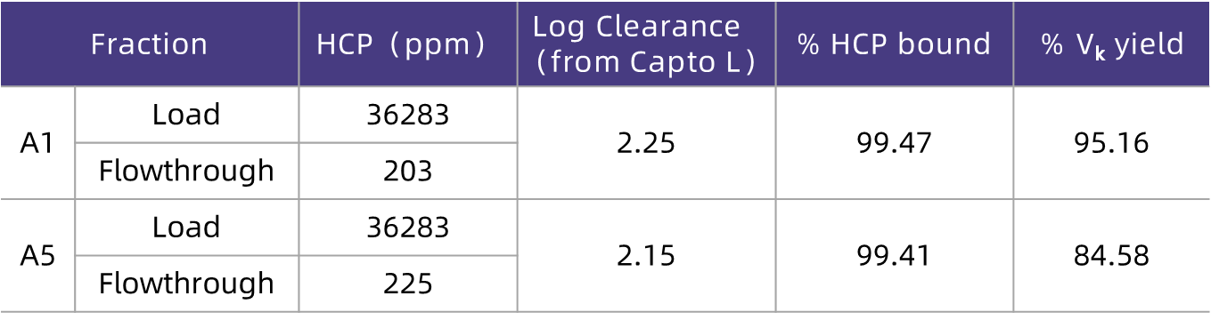 As can be seen from the test results in Figure 2, under the loading conditions of lower pH (6.0) and lower conductivity (6 mS/cm), the HCP removal effect is optimal, and the recovery rate of the target molecule Vκ is the highest. Under the optimal loading conditions, the HCP in the feed solution can be reduced from 30,000 ppm to 200 ppm (representing an HCP removal capacity of 2 log values), and the Vκ recovery rate exceeds 85% (Table 2).