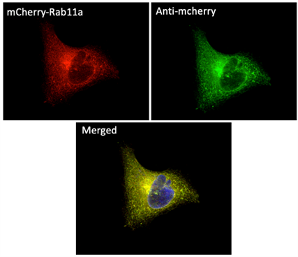 Immunofluorescence Results of MCR Cells After Transfection for mCherry-Rab11a Expression, Fixation with Methanol, and Staining with anti-Rab11a Antibody (1:250 Dilution) and anti-mCherry Antibody
